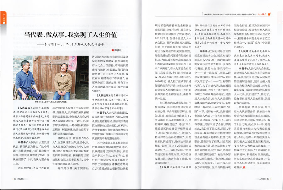林善平:虹潤公司是民營的國家高新技術企業(yè)、國家專精特新小巨人企業(yè),處于國內顯示控制儀表行業(yè)的領先地位。沒當選代表前,我的人生目標只有一個——“造一流儀表”,而自從跨進議政履職平臺后,我的人生目標又增加了一個——“當稱職的代表”。為了當好代表,我在履職之初就給自己劃了一條“底線”:本職工作和商務活動再忙,只要是人大的會議、省市人大組織的集體履職活動,就必定參加。如果時間上有沖突,公司的事就“讓路”一下。記得有一次,我到福州參加省人代會,一位客商在順昌的公司總部等了我好幾天,最后等不住,只好取消了合作。即便如此,我仍然不改初衷。而且,于我來說,履職對我更好地經營管理企業(yè)有很大的幫助。擔任代表職務,使我開闊了視野,對黨和國家的大政方針政策、法律法規(guī)有了更多更好的領會,民主意識、法治意識、誠信意識更強了,有助于辦好企業(yè)、規(guī)范管理、開拓市場、規(guī)避風險。10多年來,公司的核心競爭力不斷增強,生產與銷售持續(xù)領跑全行業(yè),被評為國家知識產權優(yōu)勢企業(yè)、福建省七家入選國家智能制造標準應用試點企業(yè)之一、福建省十家院士專家示范工作站之一,“虹潤”成為“中國馳名商標”。