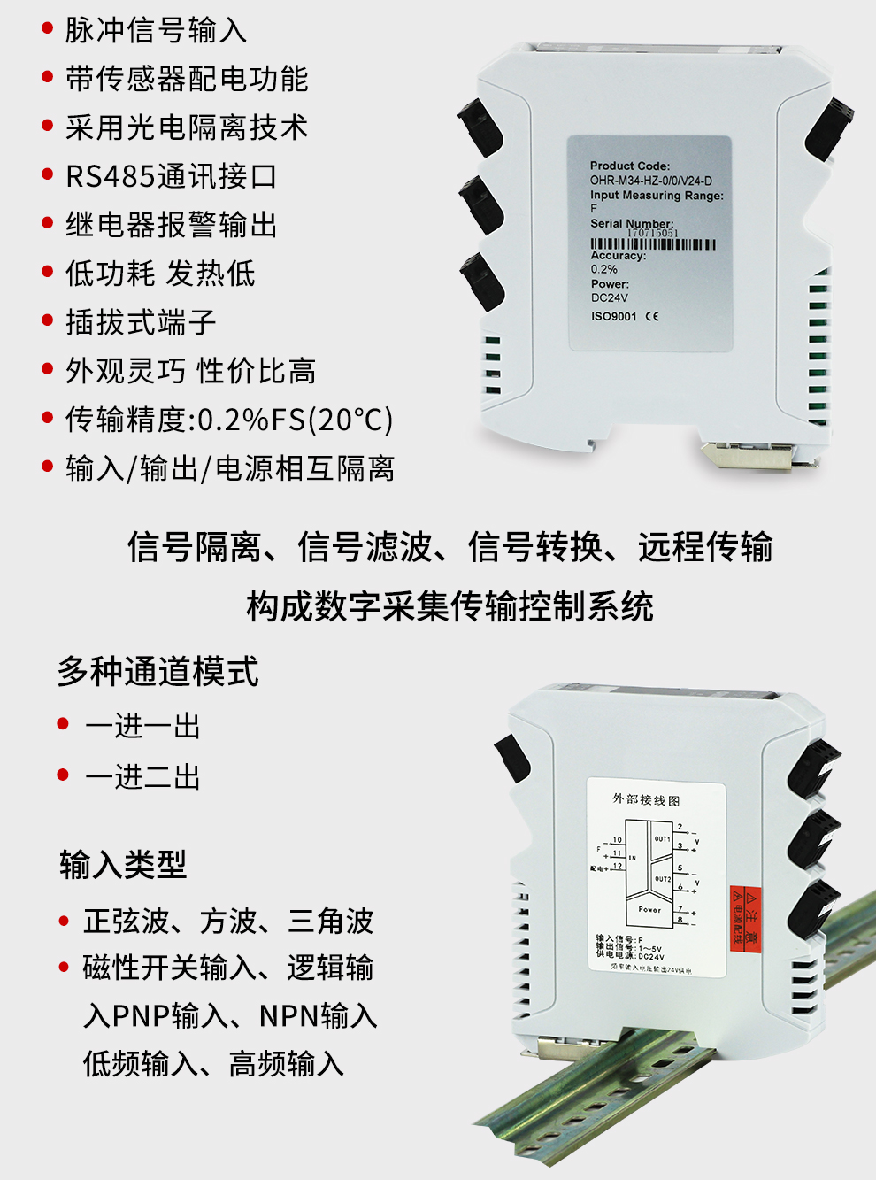 OHR-M34系列智能頻率轉(zhuǎn)換器將頻率信號(hào)經(jīng)隔離整形放大后,變送隔離輸出所需的信號(hào),也可向現(xiàn)場的一次儀表提供電源回路。