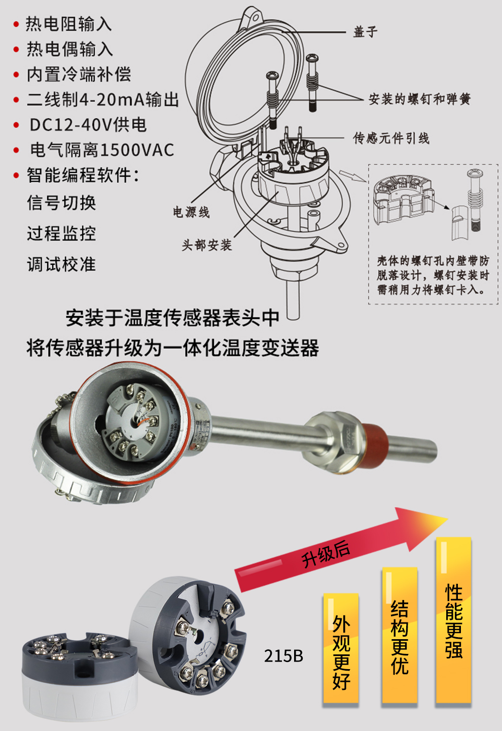 溫度變送器將現(xiàn)場(chǎng)的熱電阻或熱電偶等溫度傳感器信號(hào)經(jīng)過(guò)隔離放大處理,轉(zhuǎn)換為與溫度成線性的二線制4-20mA信號(hào)輸出至控制系統(tǒng)。