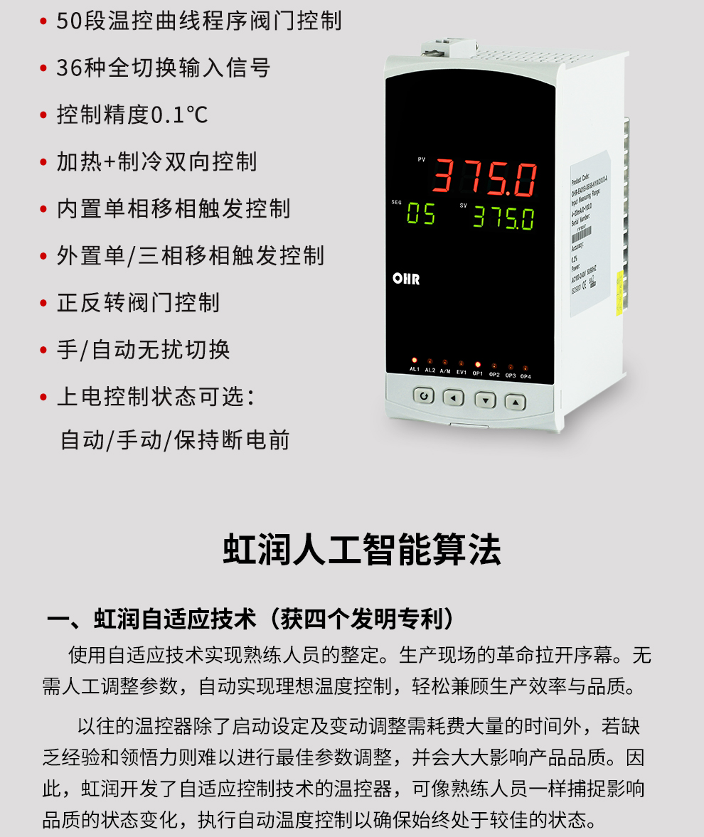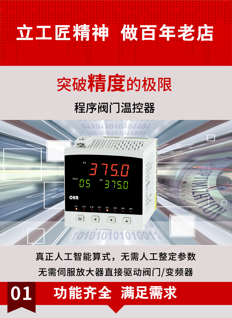 OHR-E401系列程序閥門溫控器/調(diào)節(jié)儀采用真正的人工智能算式,儀表啟動自整定功能,可以根據(jù)被控對象的特性,自動尋找最優(yōu)參數(shù)以達(dá)到很好的控制效果,無需人工整定參數(shù)。控溫精度基本達(dá)±0.1℃,無超調(diào)、欠調(diào),達(dá)國際先進(jìn)水平。