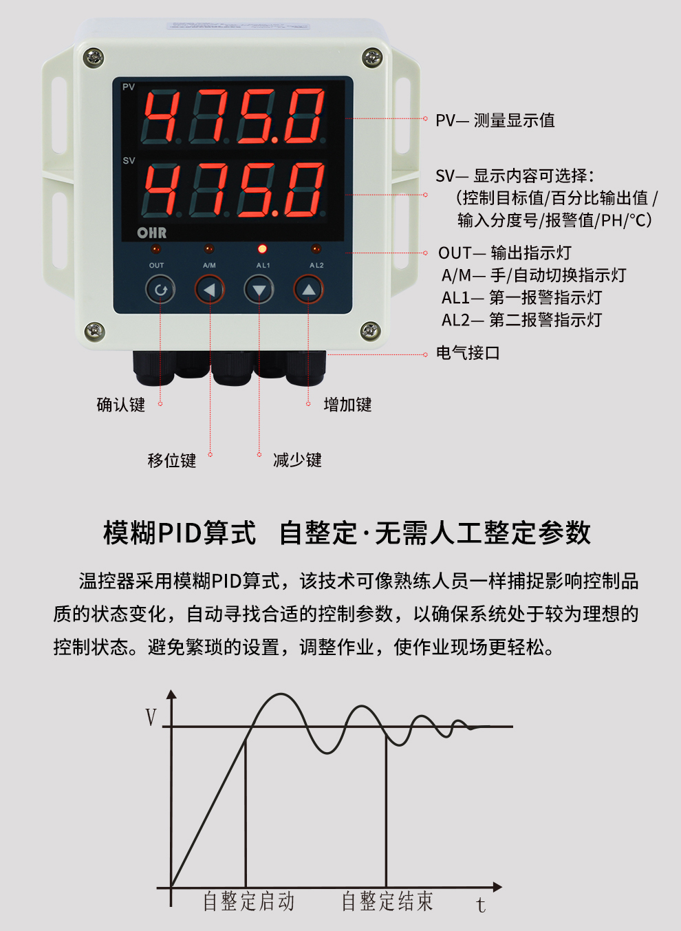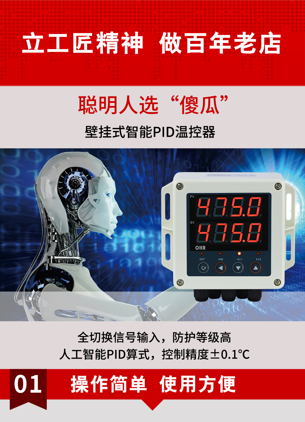 OHR-BG30/BG40系列壁掛式智能溫控器/60段程序溫控器采用了表面貼裝工藝,全自動(dòng)貼片機(jī)生產(chǎn),具有很強(qiáng)的抗干擾能力。本儀表采用人工智能算式,儀表啟動(dòng)自整定功能,可以根據(jù)被控對(duì)象的特性,自動(dòng)尋找參數(shù)以達(dá)到很好的控制效果,無(wú)需人工整定參數(shù),控溫精度基本達(dá)±0.2℃,無(wú)超調(diào)、欠調(diào),性?xún)r(jià)比高。