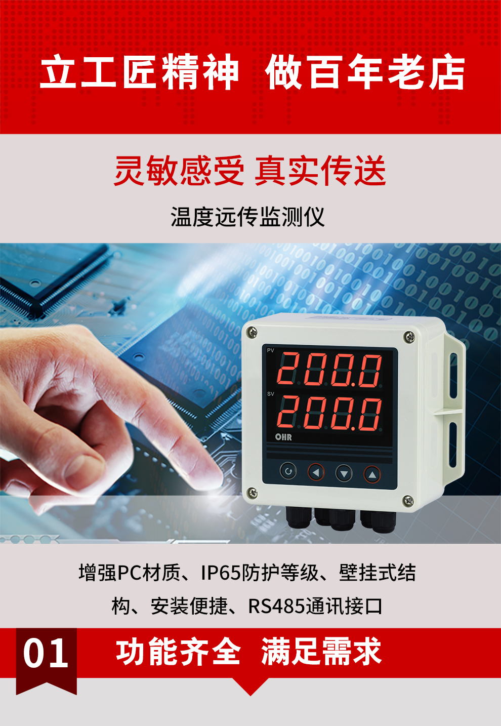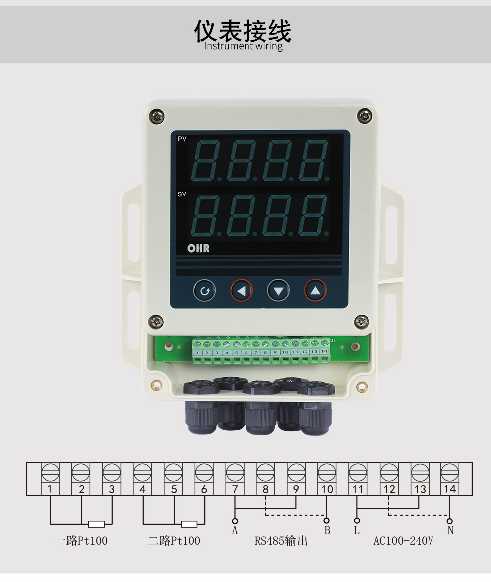 OHR-XTRT系列溫度遠(yuǎn)傳監(jiān)測儀采用了表面貼裝工藝,全自動貼片機(jī)生產(chǎn),具有很強的抗干擾能力。本儀表支持兩路PT100輸入,實現(xiàn)對溫度物理的測量顯示,帶RS485通訊輸出功能,帶雙屏數(shù)碼管顯示,上窗口顯示第1路測量值,下窗口顯示第2路測量值。