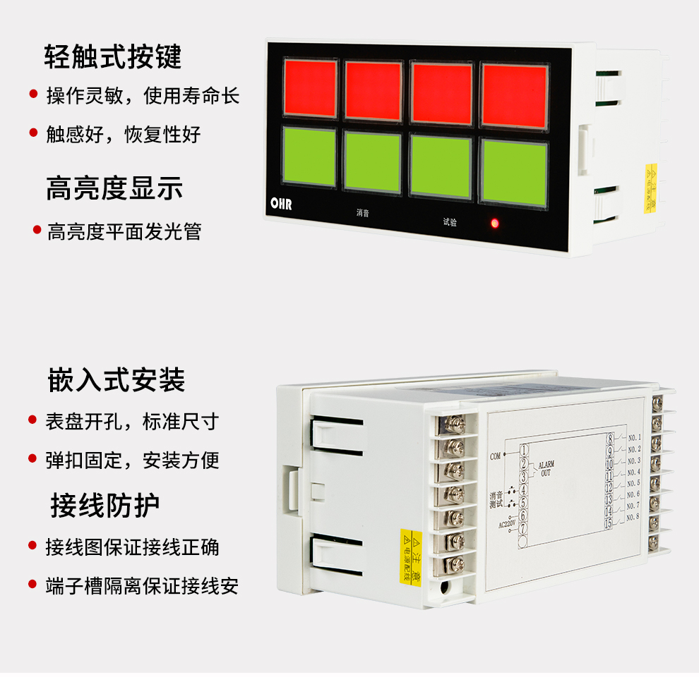 OHR-E810系列八路閃光報警器是一種接點式聲光報警顯示儀表,具有電路簡單、元件少、可靠性高、抗干擾能力強、低功耗、低噪聲、EMC電磁兼容等特點,廣泛運用于電力、石化、冶金、輕工、制藥、航空等諸多領(lǐng)域。