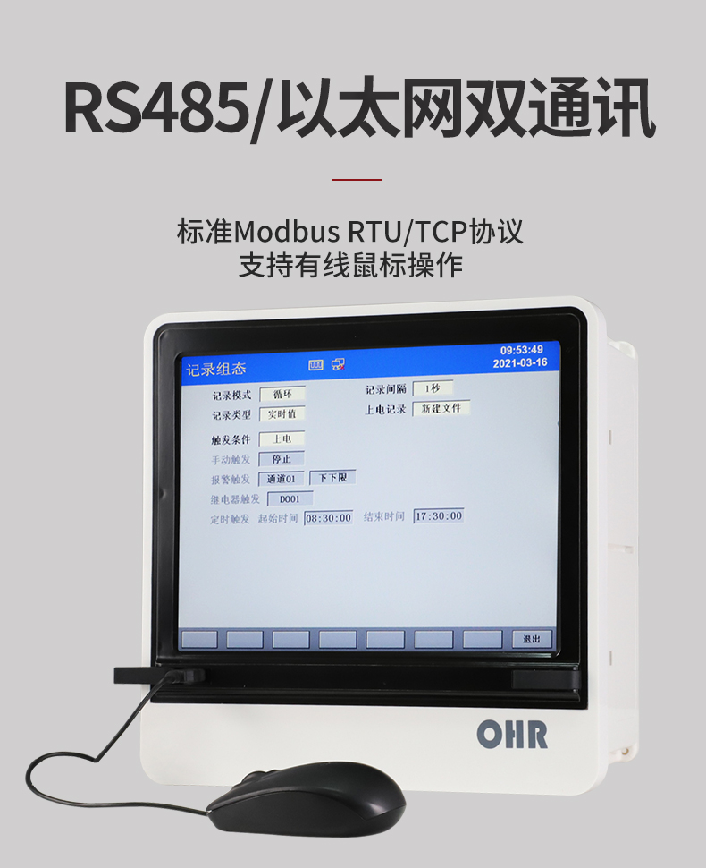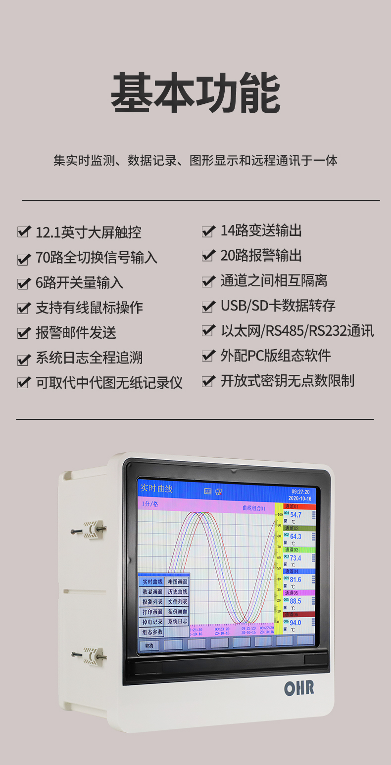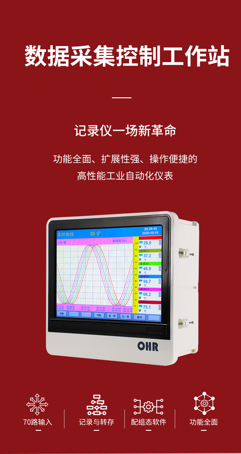 OHR-K700系列觸摸數(shù)據(jù)采集控制工作站采用新型大規(guī)模集成電路,對(duì)輸 入、輸出、電源、信號(hào)采取可靠保護(hù)和強(qiáng)抗干擾設(shè)計(jì)。70路萬能信號(hào)輸入??蓭?0限報(bào)警輸出,14 路變送輸出,6路DI輸入,RS232/485通訊接口,以太網(wǎng)接口,微型打印機(jī)接口和USB 接口,SD卡插座;支持無線鼠標(biāo)操作。