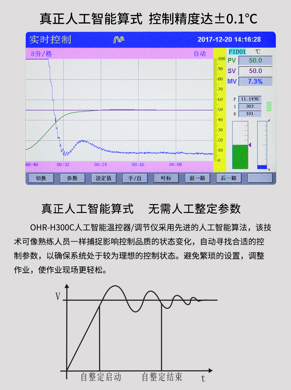 OHR-H300C系列觸摸式溫控器采用真正的人工智能算式,儀表啟動(dòng)自整定功能,可以根據(jù)被控對(duì)象的特性,自動(dòng)尋找最優(yōu)參數(shù)以達(dá)到很好的控制效果,無需人工整定參數(shù)??販鼐然具_(dá)±0.1℃,無超調(diào)、欠調(diào),達(dá)國際先進(jìn)水平。24路萬能輸入(可組態(tài)選擇輸入:標(biāo)準(zhǔn)電壓、標(biāo)準(zhǔn)電流、熱電偶、熱電阻、毫伏等)其中可帶8路控制輸入。