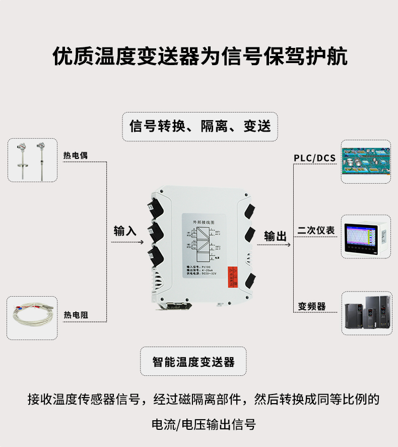 OHR-M22系列智能溫度變送器將現(xiàn)場(chǎng)的熱電阻或熱電偶信號(hào)經(jīng)過(guò)隔離放大處理,轉(zhuǎn)換為與溫度成線性的直流信號(hào)輸出至控制系統(tǒng),用作熱電偶溫度變送時(shí),具有冷端溫度自動(dòng)補(bǔ)償功能。