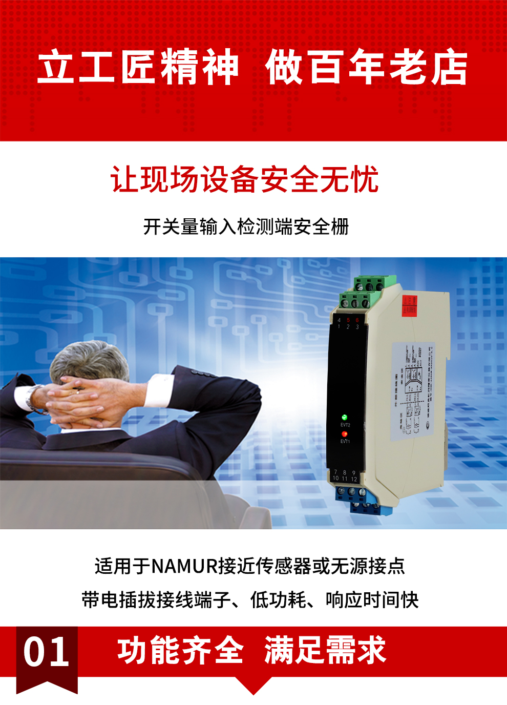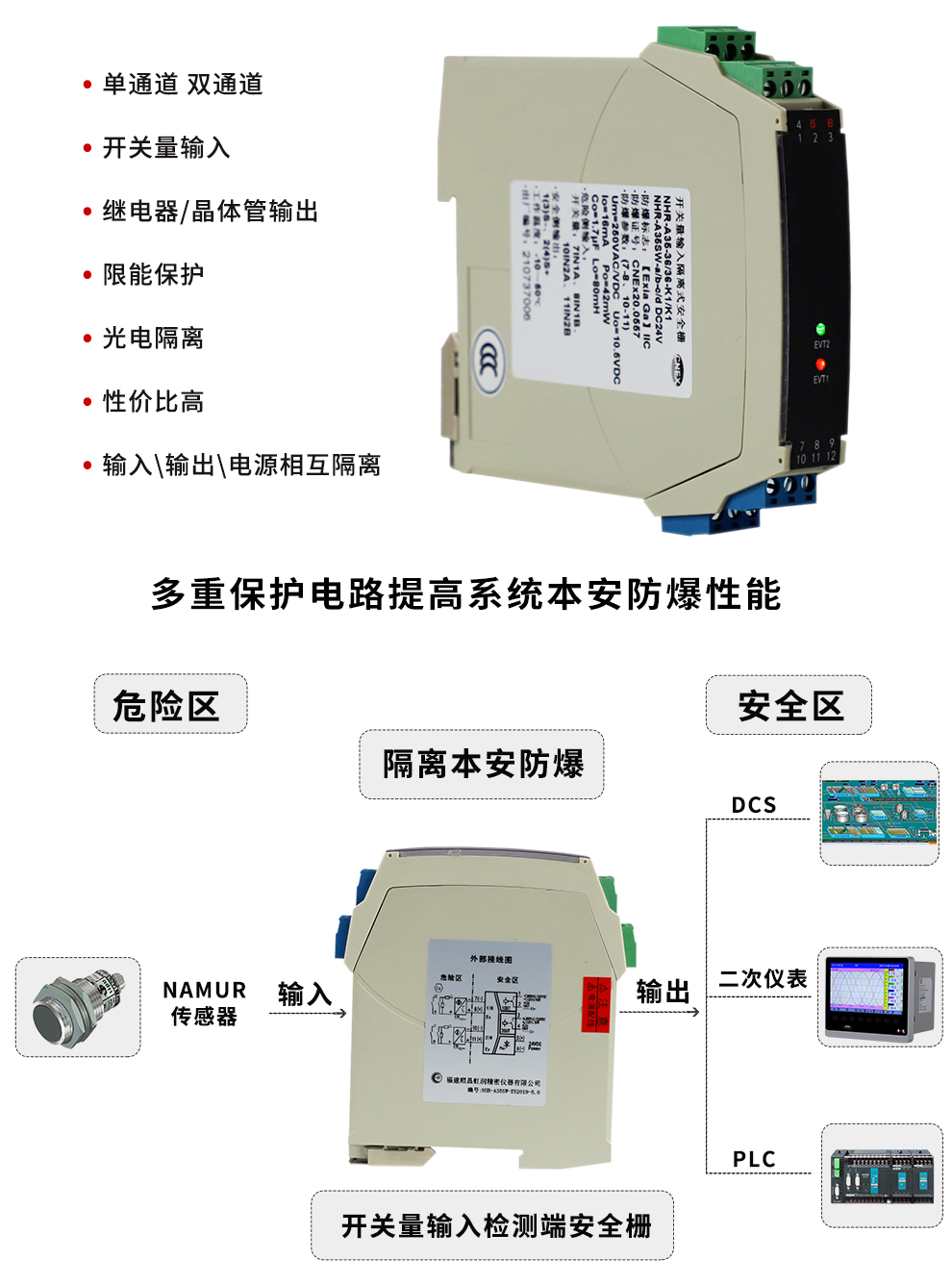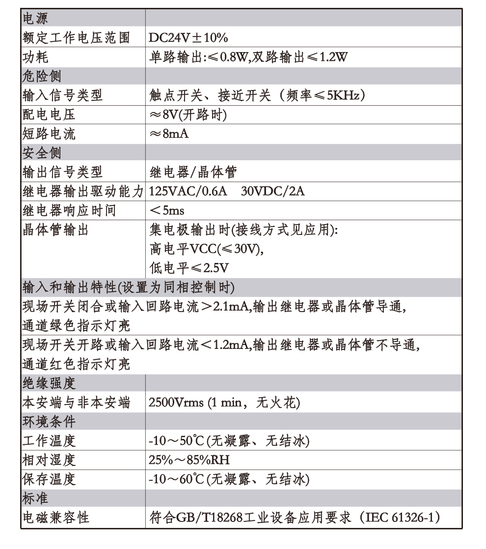 OHR-A35系列開(kāi)關(guān)量輸入檢測(cè)端隔離柵接受來(lái)自危險(xiǎn)區(qū)的開(kāi)關(guān)或接近開(kāi)關(guān)輸入,通過(guò)安全柵隔離輸出到安全側(cè)的繼電器或晶體管輸出,它具有輸入狀態(tài)檢測(cè)指示,可進(jìn)行正反向控制,該產(chǎn)品需獨(dú)立供電,輸入/輸出/電源三隔離。