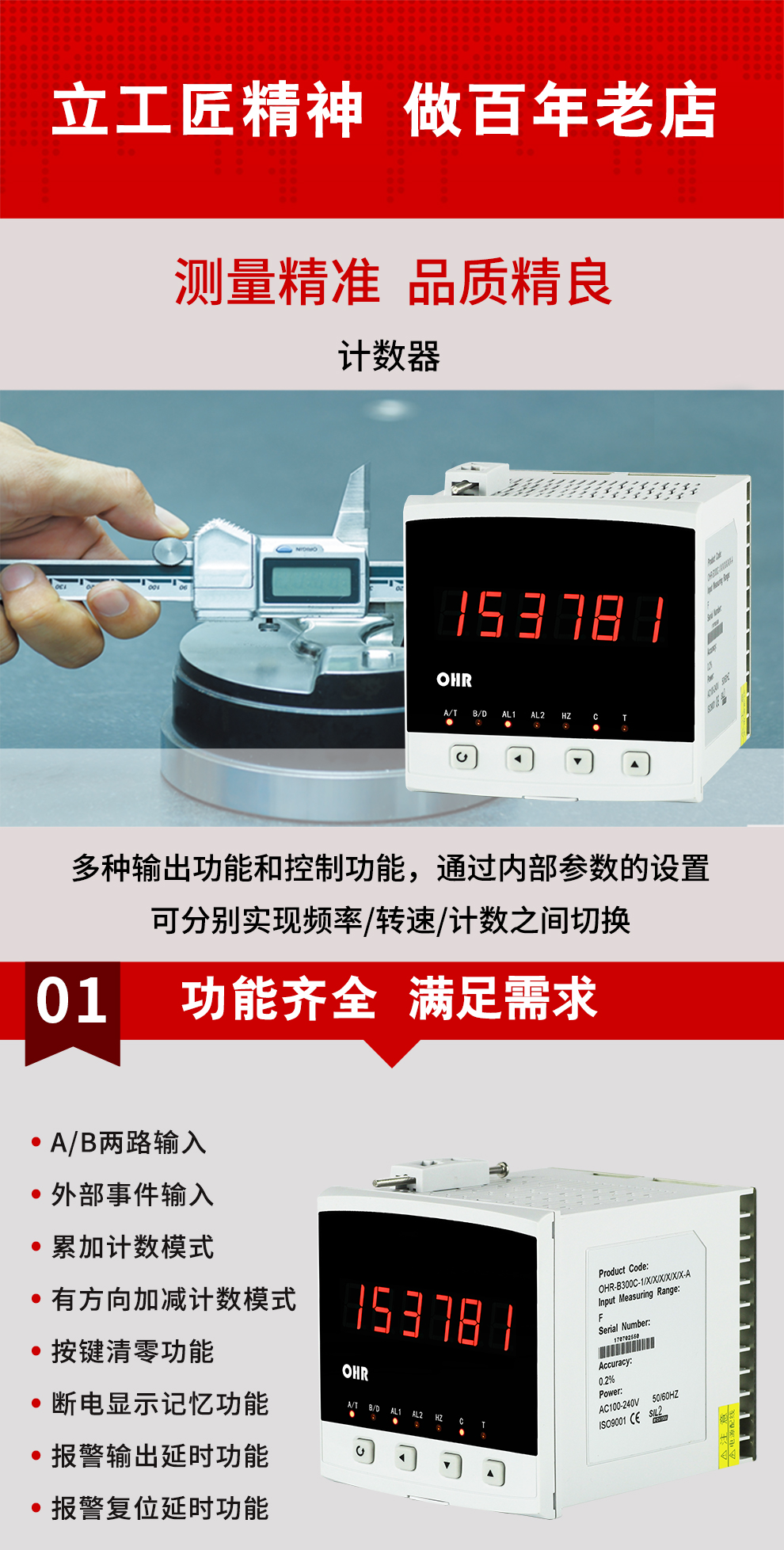虹潤(rùn)公司是專業(yè)生產(chǎn)計(jì)數(shù)器的國(guó)家專精特新“小巨人”企業(yè)。生產(chǎn)的計(jì)數(shù)器,具有A/B兩路輸入、頻率,轉(zhuǎn)速與計(jì)數(shù)功能切換,報(bào)警繼電器輸出,變送輸出,RS485通訊等特點(diǎn)。產(chǎn)品獲得基于儀表殼體、一種儀表電源等2項(xiàng)國(guó)家發(fā)明專利,主持起草流程工業(yè)中電氣/儀表和控制系統(tǒng)的試車國(guó)家標(biāo)準(zhǔn),通信系統(tǒng)多通道數(shù)據(jù)采集控制終端規(guī)范軍用標(biāo)準(zhǔn),以及現(xiàn)場(chǎng)設(shè)備集成等5項(xiàng)智能制造國(guó)家標(biāo)準(zhǔn)。參與國(guó)際5G標(biāo)準(zhǔn)制定,取得頻率轉(zhuǎn)速儀表等2項(xiàng)相關(guān)軟件著作權(quán)。產(chǎn)品廣泛應(yīng)用于電力系統(tǒng)、機(jī)械制造、汽車工業(yè)、航空航天、船舶海事、冶金礦山等行業(yè)的頻率與轉(zhuǎn)速參數(shù)監(jiān)測(cè)。