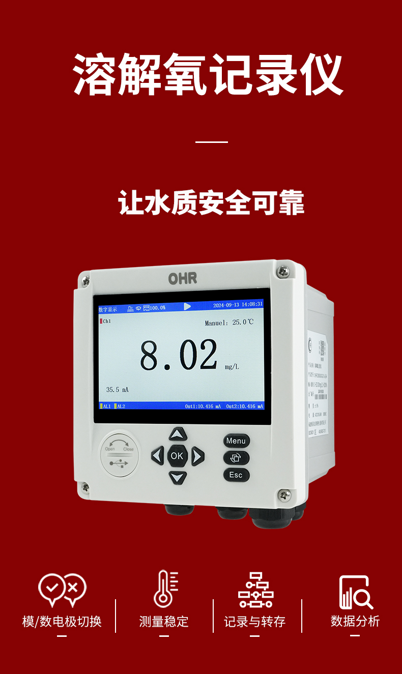 OHR-DO80系列溶解氧記錄儀是一款外觀精美、功能強(qiáng)大的在線電化學(xué)分析儀器,配接電極可測(cè)量溶解到水中的分子態(tài)氧含量。使用高清真彩液晶屏為顯示窗口,使產(chǎn)品具有顯示清晰、色彩豐富等特點(diǎn)。操作簡(jiǎn)便、響應(yīng)快,記錄存儲(chǔ)與控制功能強(qiáng)大,多種通訊接口選擇,是一款功能齊全、操作方便、精確可靠、高性價(jià)比的產(chǎn)品,在現(xiàn)場(chǎng)應(yīng)用中表現(xiàn)卓越。