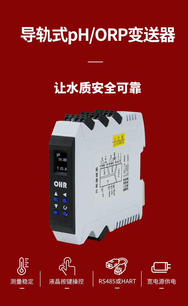 OHR-PH30系列導(dǎo)軌式pH/ORP變送器是一款用于測量水溶液pH值和ORP值的工業(yè)儀表。它將測量信號進(jìn)行隔離處 理與轉(zhuǎn)換,輸出所需信號供其他設(shè)備使用。具有二路模擬信號輸出,一路繼電器報(bào)警輸出,支持RS485通訊 或HART通訊輸出。廣泛應(yīng)用于環(huán)保水處理、純凈水、循環(huán)水、鍋爐水等系統(tǒng)以及電子、電鍍、印染、化學(xué) 、食品、制藥等制程領(lǐng)域。