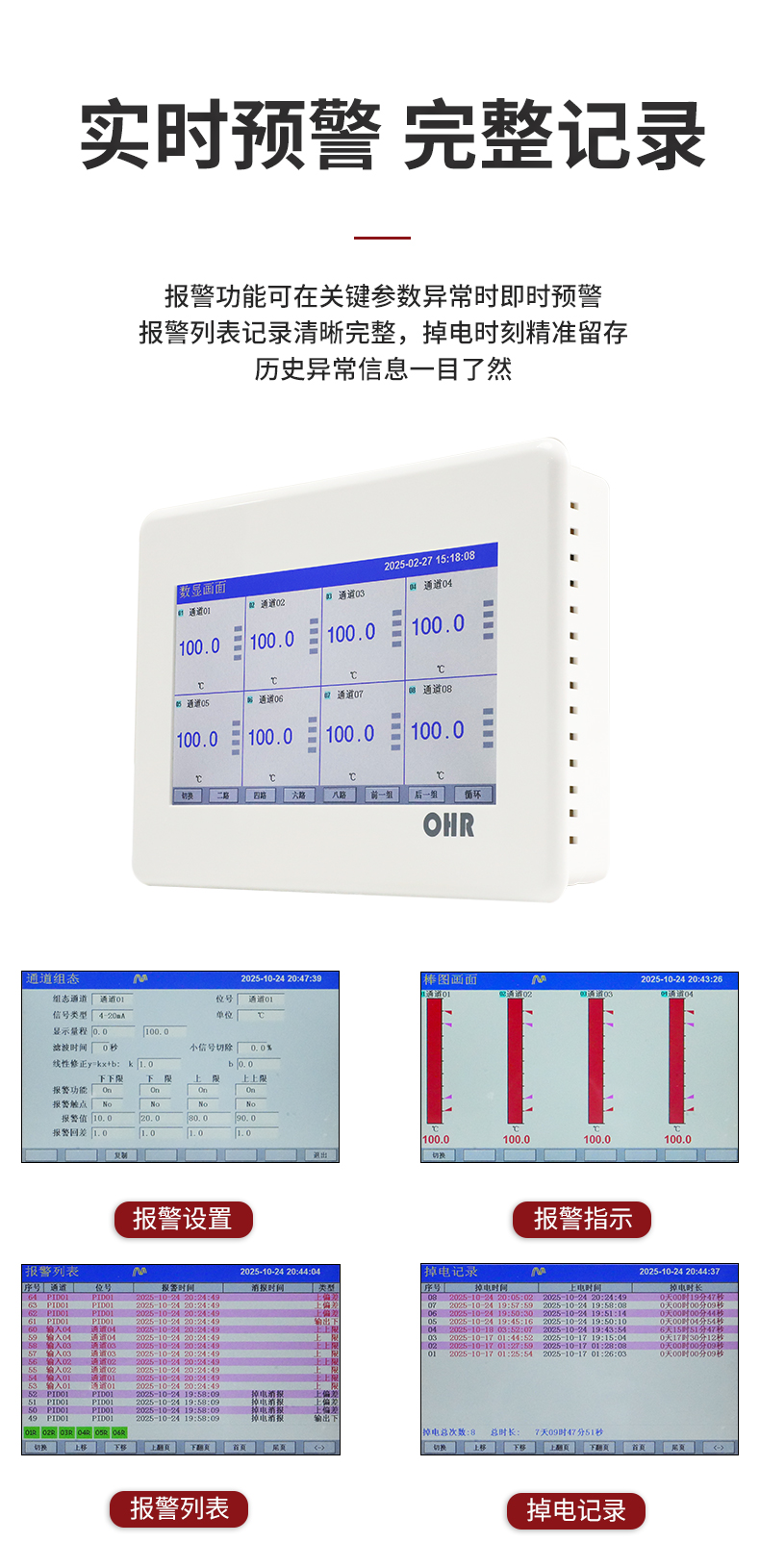 OHR系列觸摸屏數(shù)顯表采用新型大規(guī)模集成電路,對輸入、輸出、電源、信號采取可靠保護和強抗干擾設(shè)計。4路萬能信號輸入(可組態(tài)選擇輸入:標(biāo)準(zhǔn)電壓、標(biāo)準(zhǔn)電流、熱電偶、熱電阻、毫伏等)。可帶2路報警輸出,1個饋電輸出,RS485通訊接口,以太網(wǎng)接口,微型打印機接口;具有強大的顯示功能,實時測量顯示,棒圖顯示,報警狀態(tài)顯示,組態(tài)畫面顯示等。