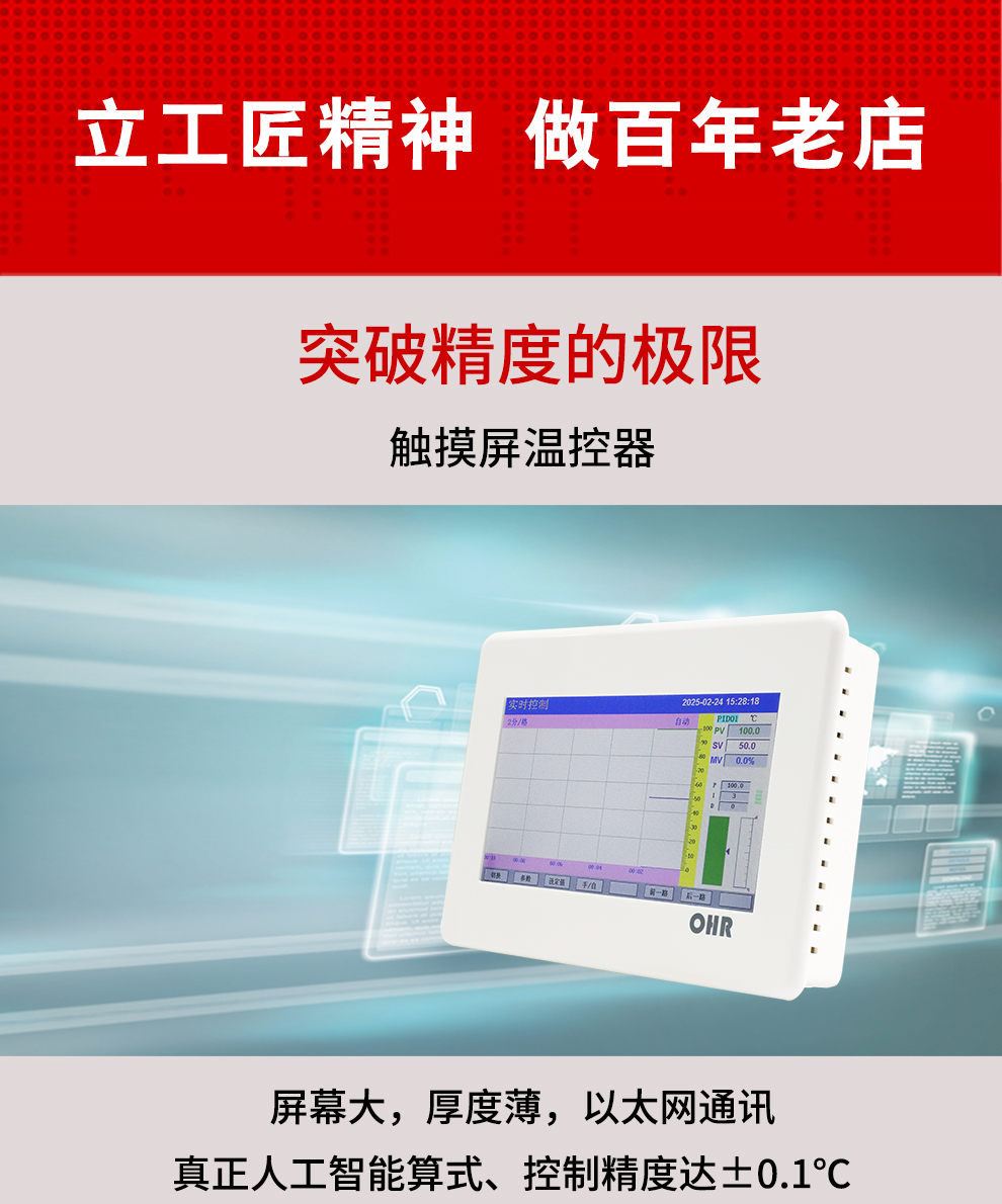 OHR系列觸摸屏溫控器采用真正的人工智能算式,儀表啟動(dòng)自整定功能,可以根據(jù)被控對(duì)象的特性,自動(dòng)尋找最優(yōu)參數(shù)以達(dá)到很好的控制效果,無(wú)需人工整定參數(shù)??販鼐然具_(dá)±0.1℃,無(wú)超調(diào)、欠調(diào),達(dá)國(guó)際先進(jìn)水平。4路萬(wàn)能信號(hào)輸入,可帶2路PID 控制,RS485通訊接口,以太網(wǎng)接口。