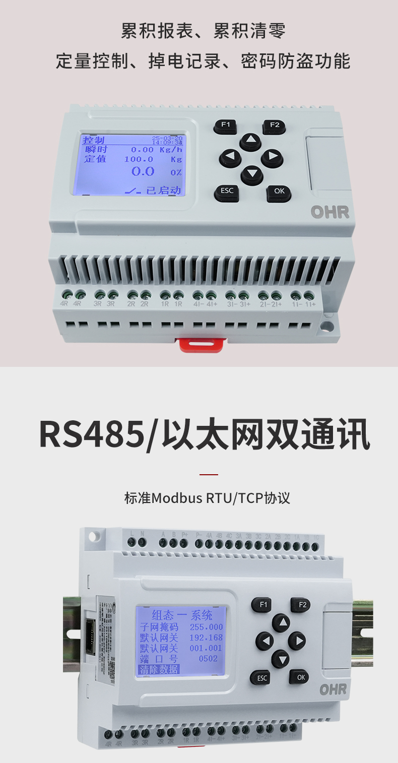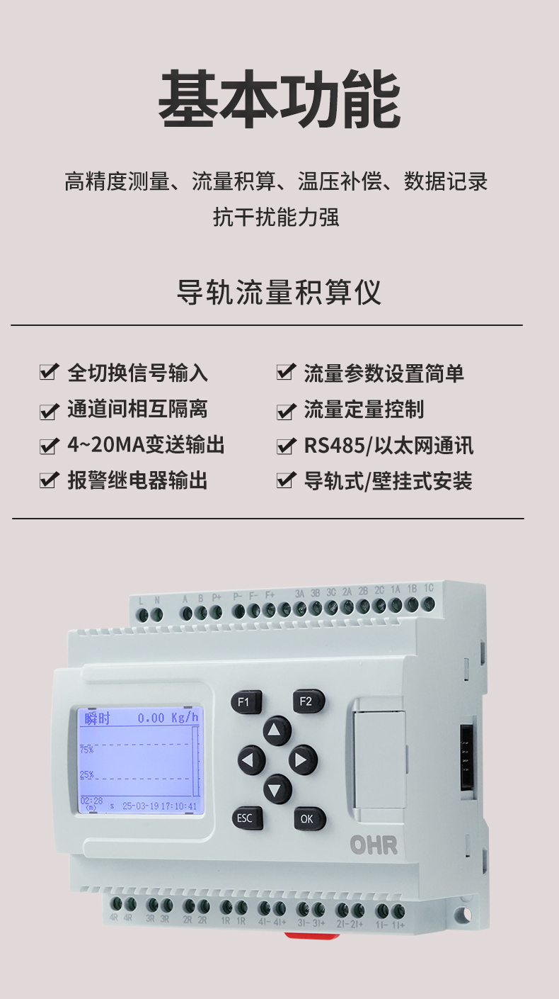 OHR-DN60系列導軌流量積算儀接收來自流量傳感器信號(差壓、脈沖等)、溫度、壓力傳感器的補償信 號實現(xiàn)對氣體、熱水和蒸汽流量進行過程監(jiān)測,總量累積及定量控制。儀表提供全中文簡化設(shè)置菜單,包含有 多種常用流量傳感器、介質(zhì)、可根據(jù)流量計算書輕松對號入座。